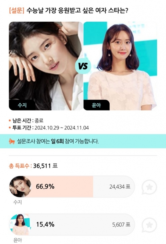 이번 투표에서 수지는 2만 4434표를 획득하며 1위를 차지했다. 뒤이어 2위 윤아(5607표), 3위 김혜윤(5464표), 4위 김지원(427표), 5위 송가인(172표) 등 순이다.