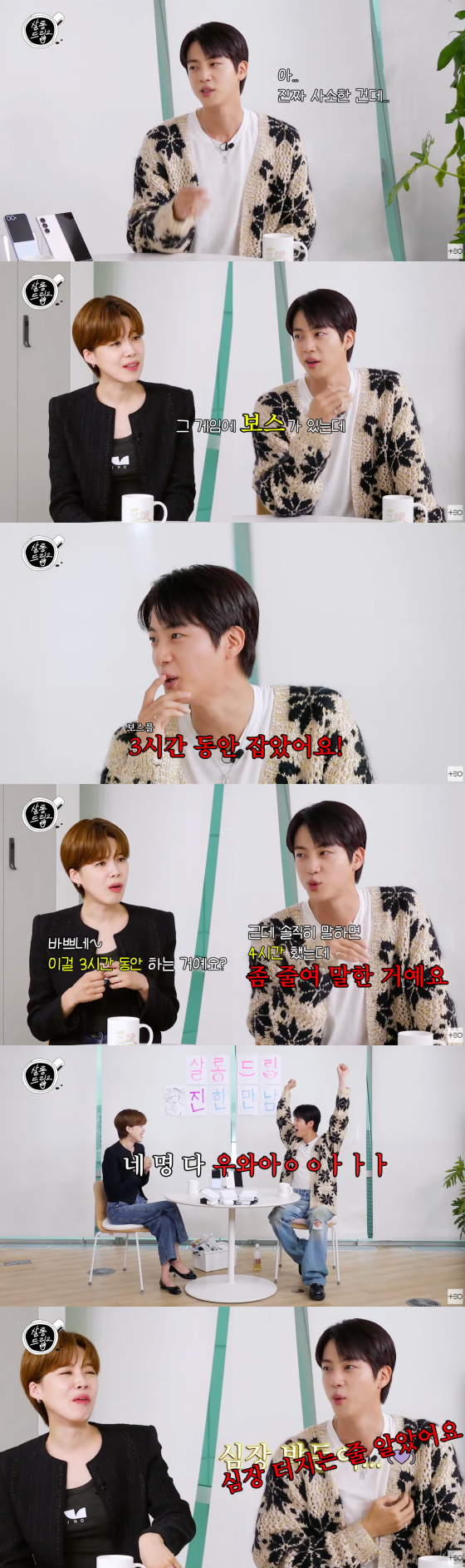 이날 진은 최근 언제 행복했냐는 질문에 "정말 사소한 것"이라며 머뭇거리더니 "게임에 보스가 있는데 그 보스를 3시간 만에 잡았다"고 답해 웃음을 자아냈다.