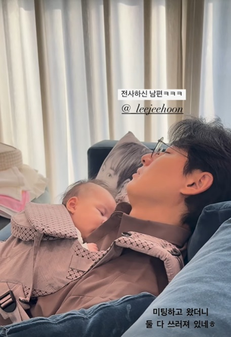 사진 속에는 이지훈이 딸 루희를 안고 곯아떨어져 있었다. 루희 역시 아빠의 품에 안겨 곤히 잠든 모습이었다.