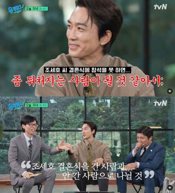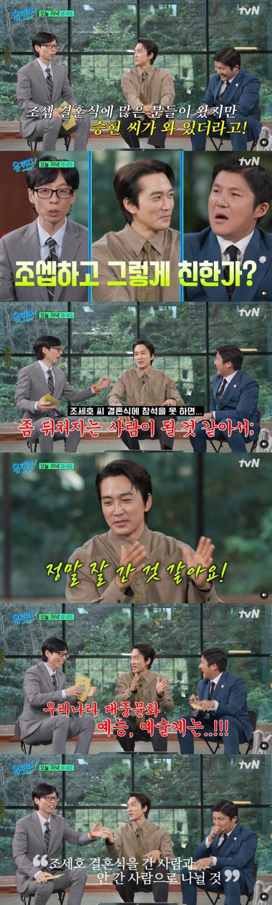 이어 그는 "제가 봤을 때 저는 그날 정말 잘 간 것 같다. 우리나라 대중문화 예능, 예술계는 조세호 결혼식을 간 사람과 안 간 사람으로 나뉠 것 같다"라고 너스레를 떨었다. 유재석은 "송승헌 씨 때문에 (조세호 결혼식이) 세기의 결혼식 됐네"라고 덧붙였다.