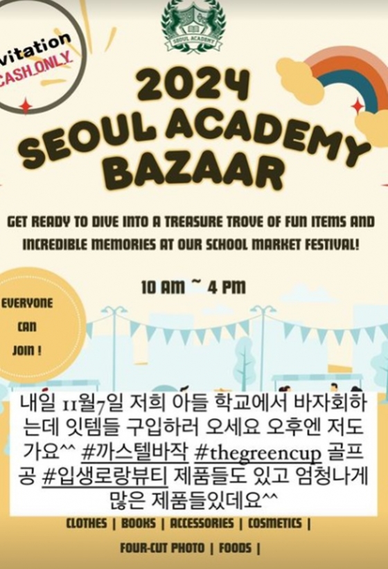 이민정은 6일 자신의 개인 계정에 아들의 학교 행사 소식을 올렸다. 아들의 학교 바자회 행사 포스터를 올린 이민정은 "잇템들 구매하러 오세요. 오후에 저도 가요"라며 아들의 학교 행사에 참석함을 알렸다.