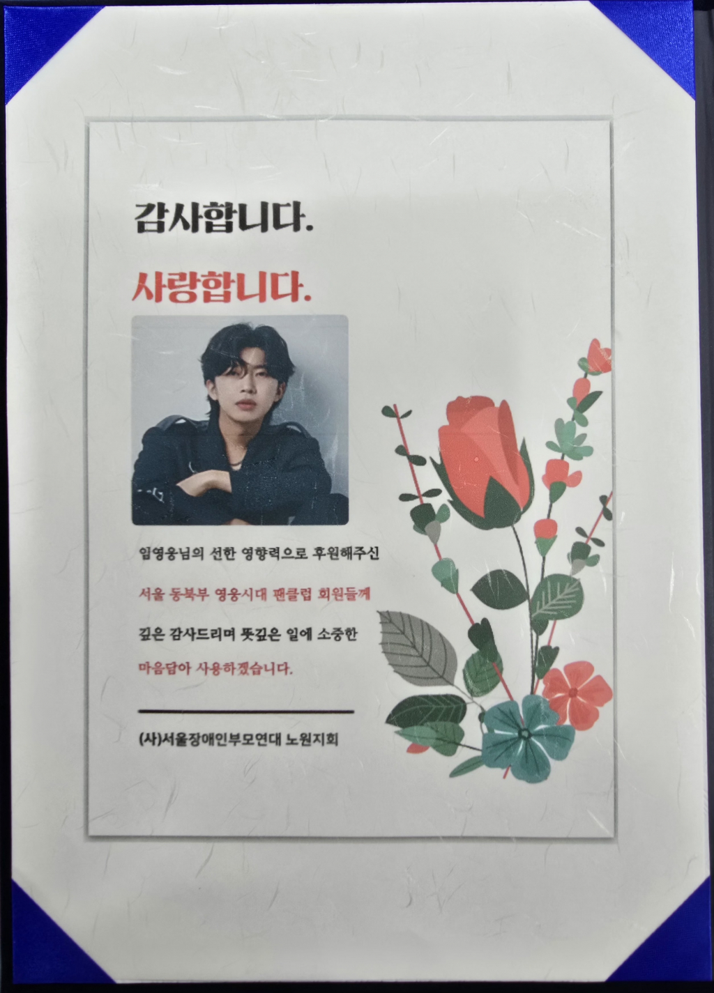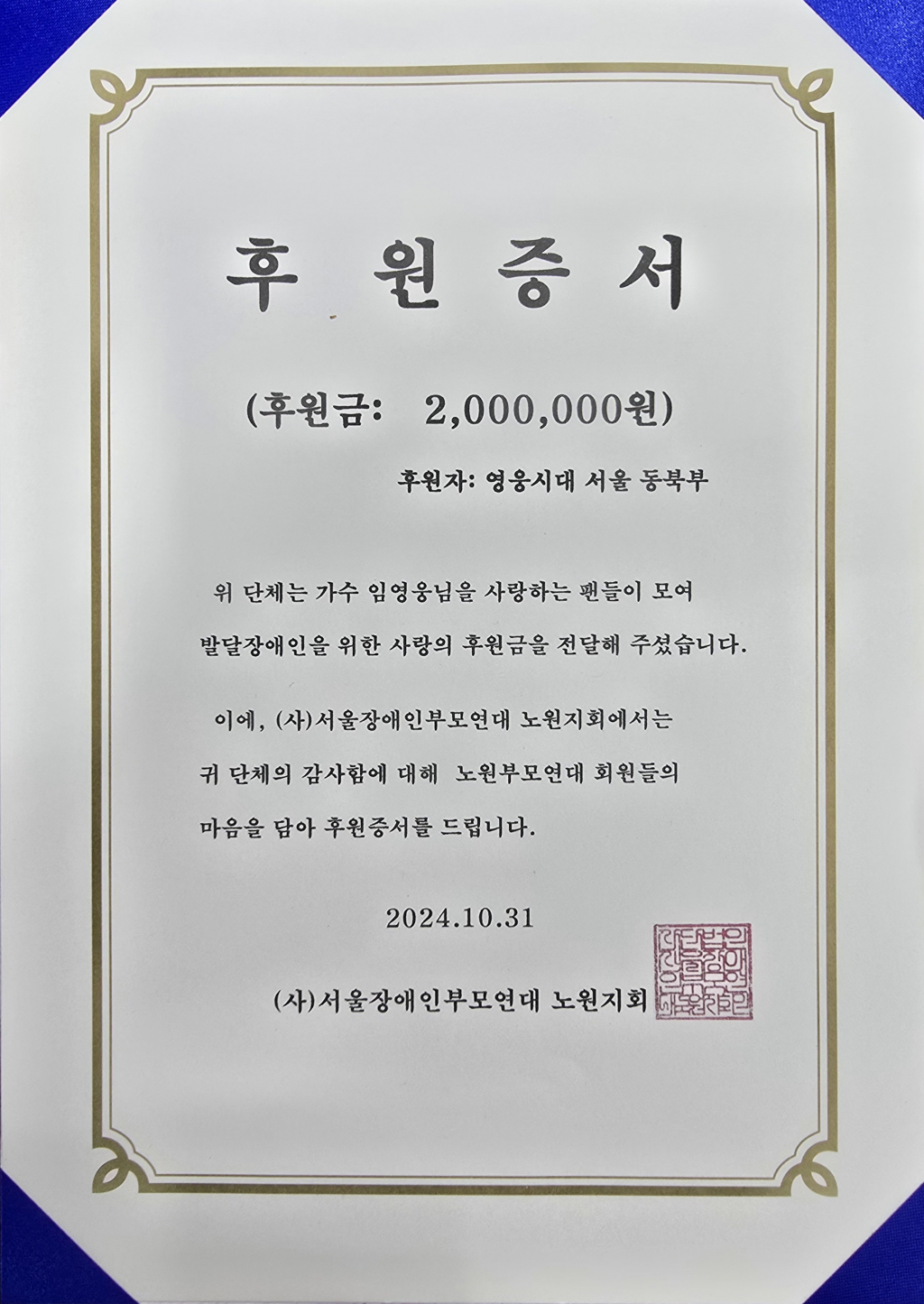 임영웅 팬클럽 영웅시대 서울동북부방은 10월 31일 서울장애인부모연대 노원지회에 200만 원을 기부했다.