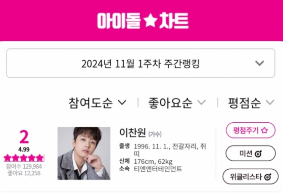 이찬원은 11월 1주 차 아이돌차트 평점랭킹에서 12만 9984표를 획득, 전체 2위를 차지했다.