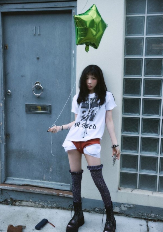 이와 함께 공개된 사진 속 태연은 흰색 티셔츠와 하의를 입은 채 포즈를 취한다. 특히 옷 위로 빨간 속옷을 입어 독특한 패션을 선보여 이목을 끈다.