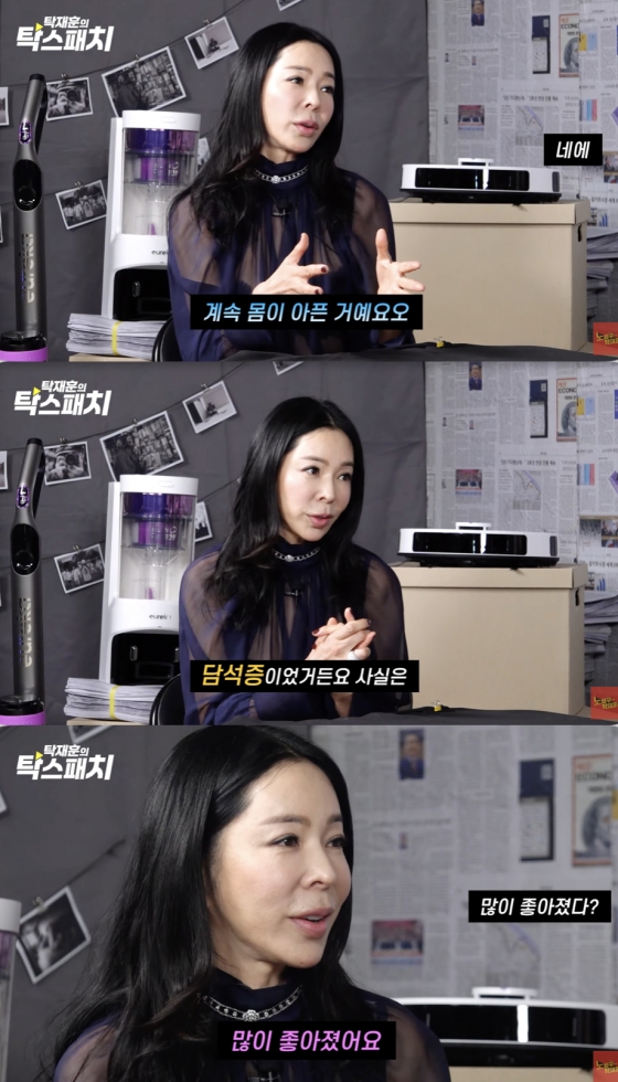 이어 1년간 근황을 묻는 탁재훈의 질문에는 "계속 몸이 어딘가 아팠다. 어느 날 도저히 못 참아서 응급실에 갔다. 담석증이었다"라고 털어놨다. 그러면서 "살이 쫙쫙 쫙 7-8kg 정도 빠졌다. 옛날에 입었던 옷을 입으니까 지금 맞더라. 그렇게 생각을 바꾸고 좋은 생각 하면서 지내니까 많이 좋아졌다"라고 뒤늦은 투병 사실을 전했다. 신규진이 "지금은 많이 좋아지신 거죠"라고 묻자 "지금은 완전히 치유돼서 웃기러 나왔다"라며 밝은 모습을 보였다.