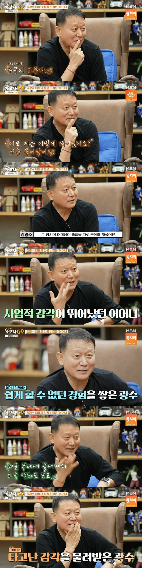 이날 김광수 대표는 "어머니가 7년 전에 돌아가셨다. 제가 형, 누나가 있는데 성이 다르다. 조문을 받으면서, 그때 처음으로 이모한테 저는 어떻게 태어났냐 물어봤다. 나의 아버지가 누구인지, 그전까지는 한 번도 물어본 적이 없었다. 엄마는 진짜 엄마인데 (아버지는) 모르겠다고 하시는 거다"라고 털어놨다.