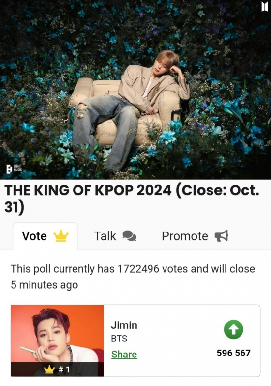 지민은 지난 10월 31일 마감된 '킹 초이스'(King Choice)의 'The King Of Kpop 2024' 투표에서 59만 6552표를 받으며 1위에 올랐다.