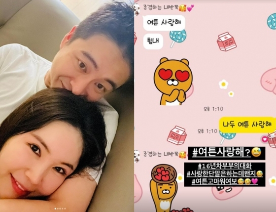 이에 장영란은 "여튼 사랑해? 16년차 부부의 대화. 사랑한단 말은 하는데 왠지 여튼 고마워 여보"라고 덧붙여 웃음을 자아냈다.