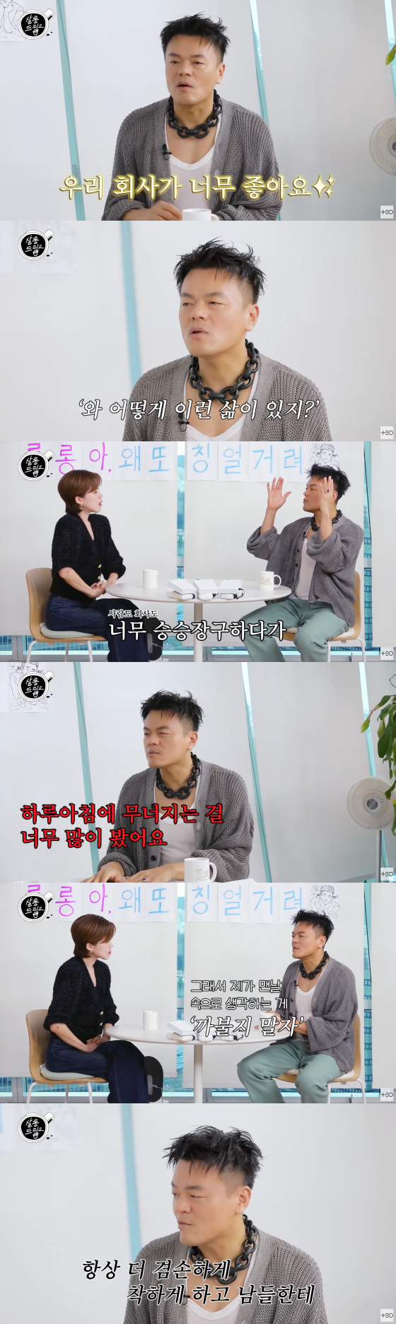 이에 박진영은 "우선 너무 재미있다. 10층 건물인 우리 회사를 가면 정말 좋다. 우리 회사가 정말 좋다. 건물에 들어설 때마다 '어떻게 이런 삶이 있지' 싶다. 건물을 지어서 내가 하고 싶은 일을 하지 않나"라고 답했다.