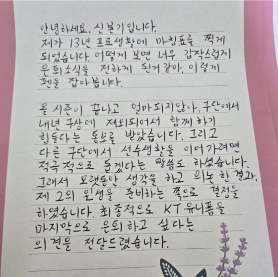 신본기는 12일 자신의 개인 SNS를 통해 "안녕하세요. 신본기입니다. 제가 13년 프로 생활에 마침표를 찍게 됐습니다"라는 문구로 시작하는 두 장짜리 자필 손편지를 공개했다.