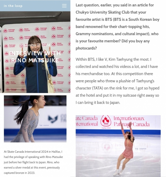 "최애 멤버는 누구이며 혹시 포토카드 같은 것도 사본 적 있느냐"는 질문에는 "뷔, 태형 오빠를 가장 좋아한다. 포토카드 수집도 하고, 뷔 오빠 영상도 많이 보고 굿즈도 갖고 있다. 이번 대회에서 뷔의 캐릭터 인형인 타타를 링크에 던져준 분도 계셨다. 너무 흥분했고 일본에 가져가기 위해 바로 여행 가방에 챙겨 넣었다"라고 말했다.