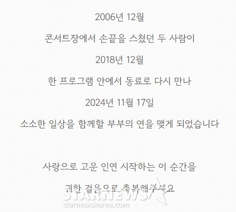 또한 청첩장에는 '2006년 12월 콘서트장에서 손끝을 스쳤던 두 사람이 2018년 12월 한 프로그램 안에서 동료로 다시 만나 2024년 11월 17일 소소한 일상을 함께할 부부의 연을 맺게 되어습니다. 사랑으로 고운 인연 시작하는 이 순간을 귀한 걸음으로 축복해주세요'라는 문구가 적혀 있어 눈길을 끌었다.