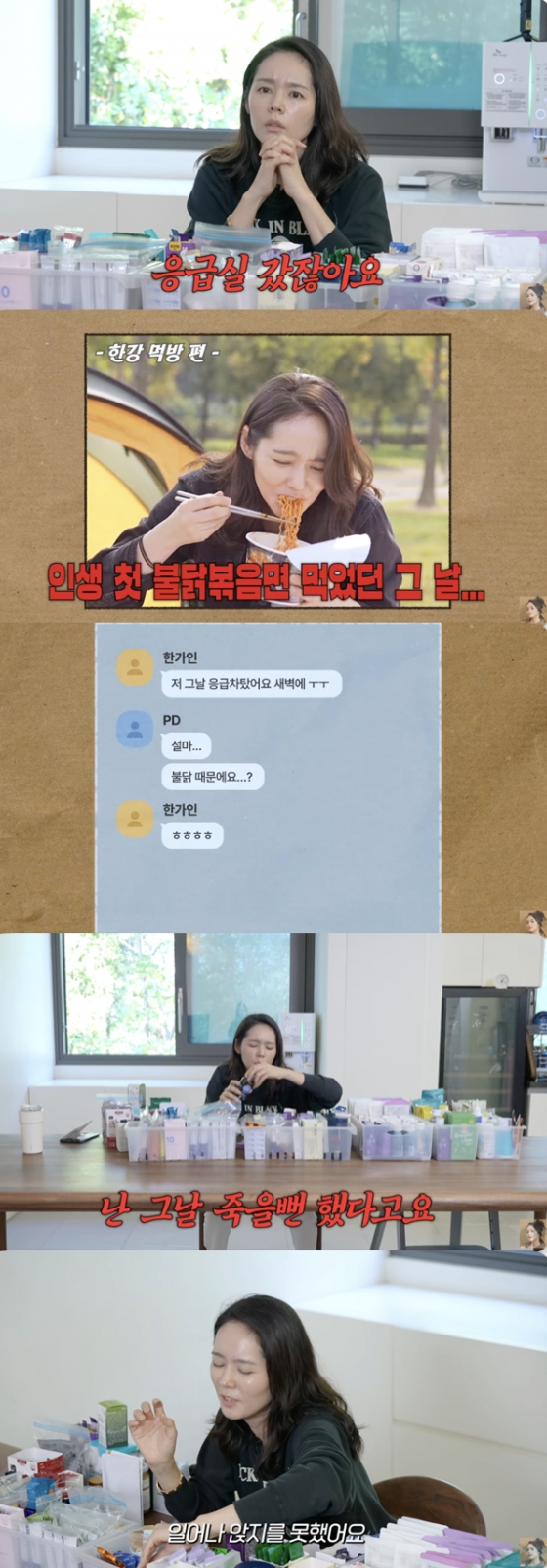 이에 한가인은 "병원 실려 가서 위 검사를 다 했는데 멀쩡하다고 하더라. 난 그날 죽을 뻔했다. 일어나서 앉지를 못했다"라며 당시 심각했던 상황을 회상했다.