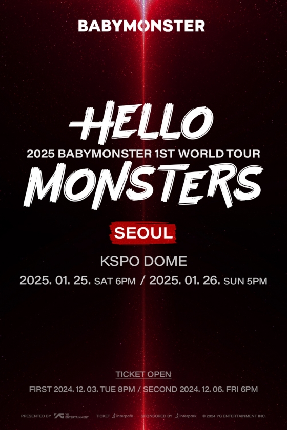 20일 YG엔터테인먼트에 따르면 베이비몬스터는 오는 1월 25일부터 26일까지 양일간 서울 방이동 올림픽공원 KSPO DOME서 '2025 BABYMONSTER 1st WORLD TOUR