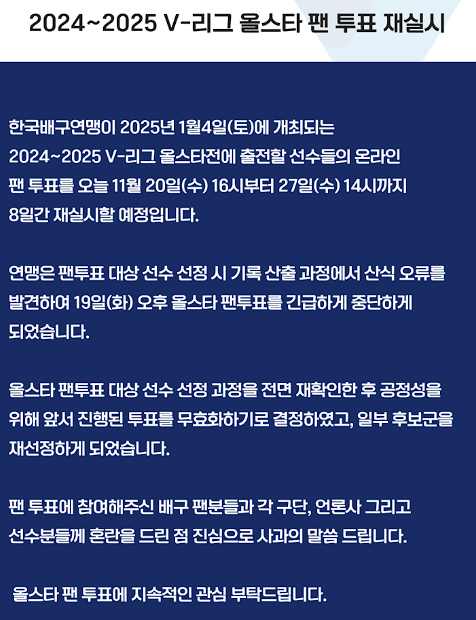 KOVO는 20일 보도자료를 통해 "2025년 1월 4일에 개최되는 2024~2025 V-리그 올스타전에 출전할 선수들의 온라인 팬 투표를 오늘 11월 20일 16시부터 27일 14시까지 8일간 재실시할 예정이다"라고 밝혔다.