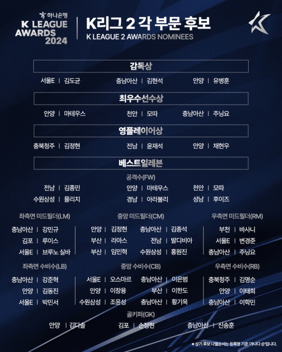 한국프로축구연맹은 '하나은행 K리그 2024 대상 시상식'을 앞두고 지난 18일 K리그 개인상 후보선정위원회를 열어 올 시즌 K리그1, 2 최우수감독상, MVP, 영플레이어상, 베스트일레븐 부문의 3배수 후보를 선정했다.