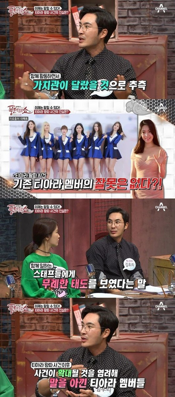 김우리는 2017년 채널A '풍문으로 들었쇼'에서 "화영이 티아라가 고생하면서 얻은 것들을 한꺼번에 받다 보니까 활동하면서 체계가 없었다. 소위 말하면 버릇이 없었다. 내가 단호하게 말할 수 있는 것은 폭로전에 대해 기존 티아라 멤버 잘못은 없다"라고 밝혔었다. 또 그는 "티아라 숙소에서 일어난 팩트까지는 모르지만, 어떻게 삐걱댔는지는 다 알고있다"라며 "화영이 미용실에서 머리 감겨주는 헤어 스태프를 샴푸라고 불렀다. '샴푸, 가자'라고 했다더라"라는 소문을 퍼뜨렸다.