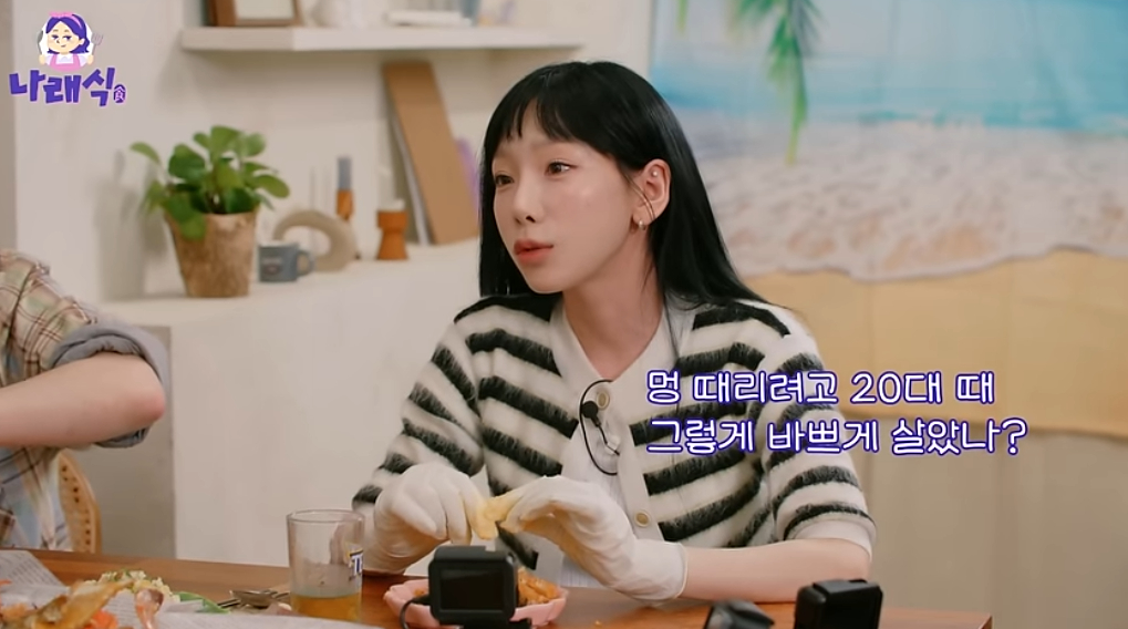 이에 박나래는 "요양원이지 않냐"라고 반응했고 태연은 "요즘 내가 이렇게 멍 때리려고 20대 때 그렇게 바쁘게 살았나 라는 생각을 한다"라고 답했다.