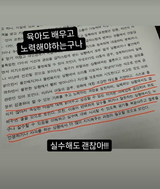 이에 이지혜는 "고쳐야지! 표정관리하란 말이야"라며 "육아도 배우고 노력해야 하는구나. 실수해도 괜찮아!"라는 굳은 다짐을 전했다.