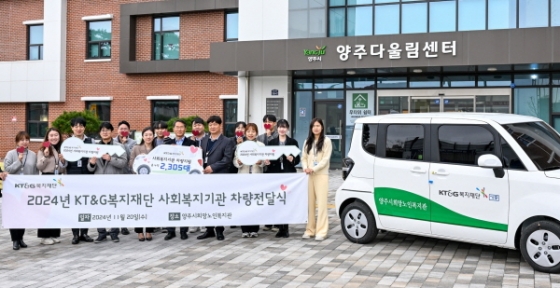 KT&G복지재단이 지난 20일 경기 양주시 희망노인복지관에서 '2024 사회복지기관 차량 전달식'을 갖고 전국 사회복지기관에 경차 105대를 지원했다.