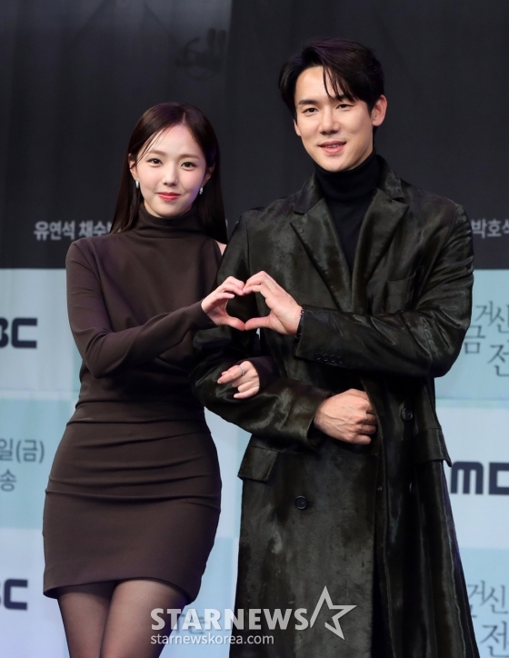 [서울=뉴시스] 김혜진 기자 = 배우 채수빈(왼쪽), 유연석이 21일 오후 서울 마포구 MBC에서 열린 MBC 새 금토드라마 '지금 거신 전화는' 제작발표회에서 포즈를 취하고 있다. '지금 거신 전화는'은 협박 전화로 시작된, 정략결혼 3년 차 쇼윈도 부부의 시크릿 로맨스릴러다. 오는 22일 오후 9시 50분 첫 방송된다. 2024.11.21. jini@newsis.com /사진=김혜진