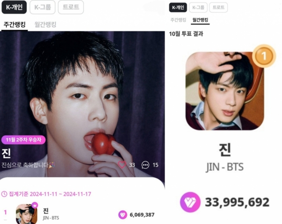 진은 마이원픽 'K-POP 개인부문 주간랭킹' 11월 2주차(11월 11일~11월 17일) 투표에서 606만 9387개의 하트를 얻어 1위에 올랐다.