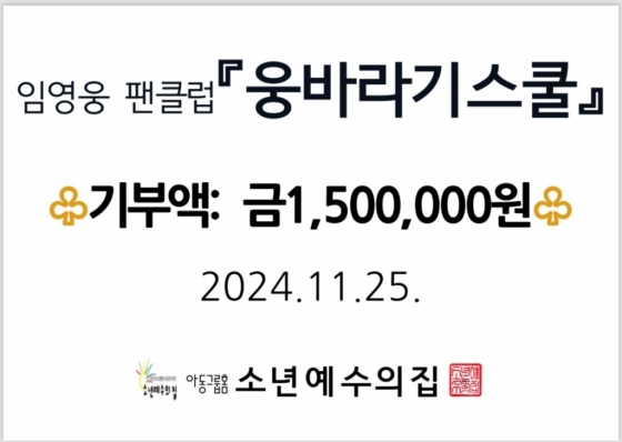 임영웅 팬클럽 '잠실 웅바라기스쿨'회원들은 11월 25일 서울 송파구 아동그룹홈 '소년예수의집'을 방문, 150만 원 정기 후원금과 30만 원 상당 과일을 전달했다.