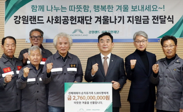 강원랜드사회공헌재단은 26일 사북 광산진폐권익연대사무실에서 '2024년 겨울나기지원사업 지원금 전달식'을 갖고 폐광지역 7개 지역과 강원특별자치도 내 진폐재해자 및 탄광순직자 유가족 5,895명에게 총 27억원을 전달했다.