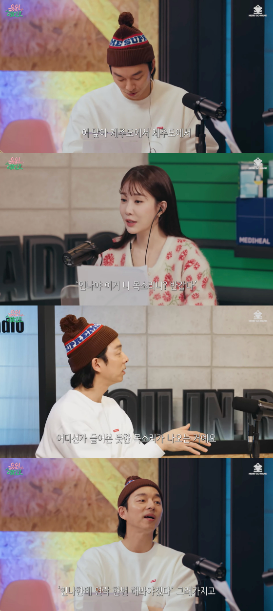 이에 공유는 "제주도에서 낚시를 함께 하는 형 차에 탔는데 내비게이션에서 익숙한 목소리가 들리더라. 아무리 들어도 인나 씨 목소리였다"고 회상했다.