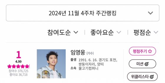 임영웅은 11월 15일부터 11월 21일까지 집계된 아이돌차트 평점랭킹에서 37만 6725표를 얻어 1위를 차지했다.