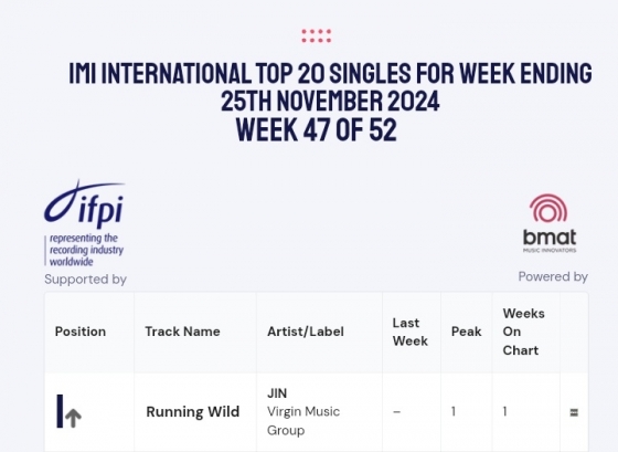진의 'Happy'(종합지수 15,608.61점)는 일본에서 2주 연속 1위를 차지하며 독보적인 인기를 입증했다. 중국에서도 진의 'Happy'(종합 지수 30,983.48점)가 1위에 올랐다. 진은 11월 4주차 한터 국가별 차트에서 2관왕을 달성하며 솔로 아티스트로서의 눈부신 역량과 영향력을 증명했다.