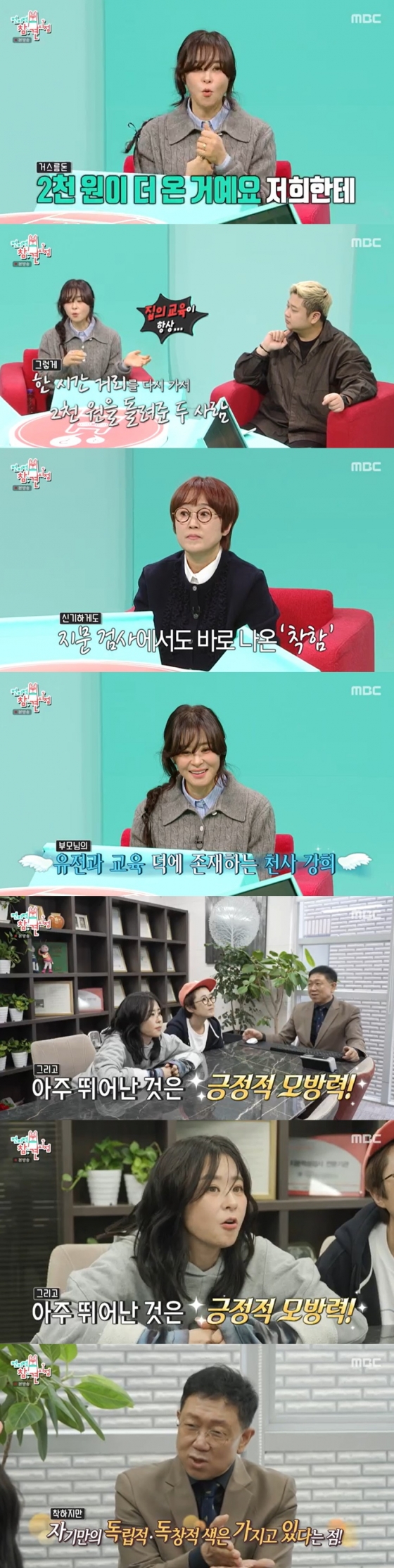 전문가는 최강희에게 "강희 씨는 동글동글한 무늬가 많다. 다 동일한 무늬를 가지고 있다. 이러한 지문을 가진 사람은 일단 '착하다'다. 독창적인 착함이다. 그리고 긍정적 모방력이 좋다. 누군가 롤모델이 있으면 잘 가져다가 쓴다"라고 설명했다.
