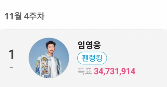 임영웅은 2024년 11월 4주차 팬앤스타 솔로 랭킹에서 3473만 1914표를 획득해 1위를 기록했다.