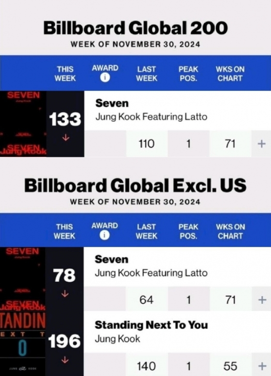 미국 음악 전문 매체 빌보드가 발표한 최신 차트(11월 30일 자)에 따르면, 정국이 지난해 7월 발매한 솔로 싱글 'Seven'(세븐)은 '글로벌 200' 차트 133위에 올랐다.