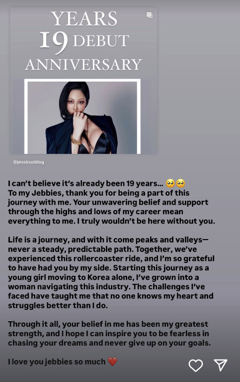 제시는 2일 자신의 인스타그램 스토리를 통해 "벌써 19년이 흘렀다. 나와 함께 이 여정을 함께 해준 팬들에게 고맙다. 내 경력에 대한 믿음, 지지는 내 모든 걸 의미한다. 여러분이 없었다면 난 여기 없었을 것"이라고 말문을 열었다.