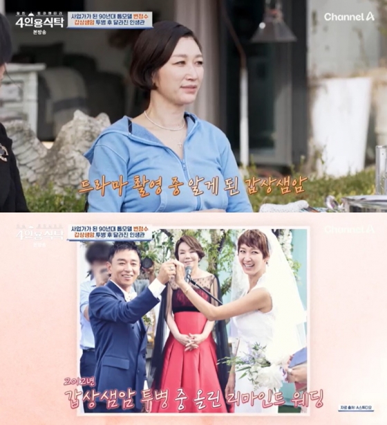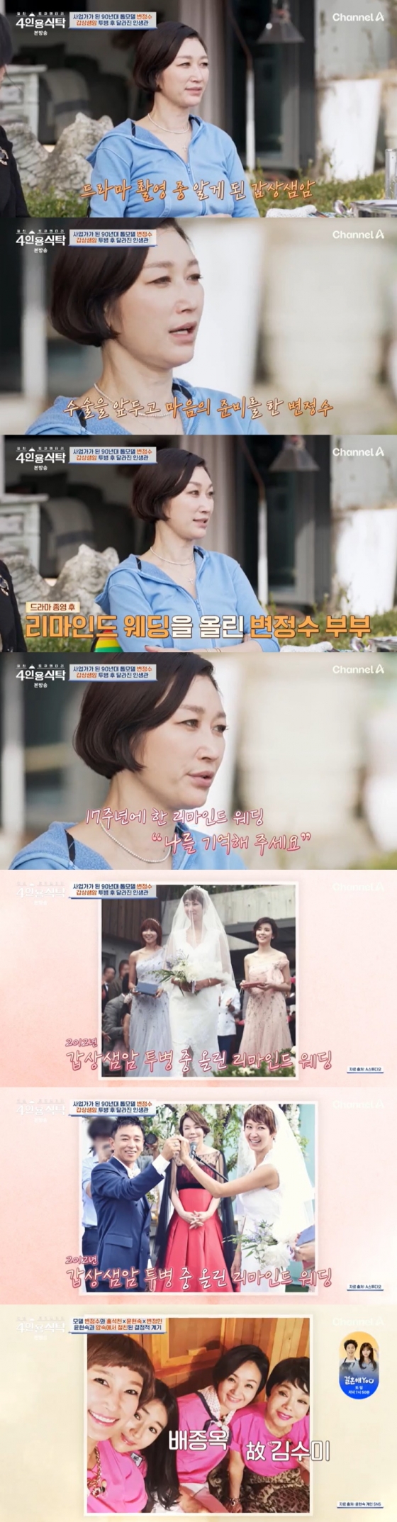윤현숙은 "그런데 얘한테 그때 사연이 있었다"라고 했고 변정수는 "드라마 촬영 중에 갑상샘암이 생긴 걸 알았다. 드라마 종영 후에 리마인드 웨딩을 했다. 보통 10주년 주기로 (리마인드 웨딩을) 하는데 나는 17주년에 '내가 죽을 수도 있다. 나를 기억해 달라'라는 의미로 했다"라고 터놓았다.