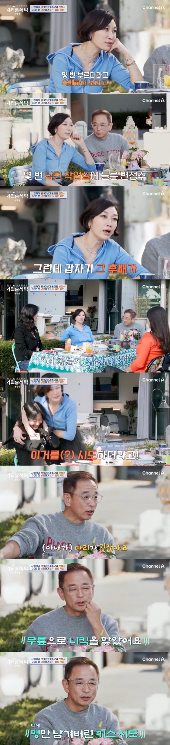그는 "우리가 미대였는데 남편이 작업실로 불러서 몇 번 갔다. 그런데 갑자기 후배가 먼저 가더라. 그래서 둘만 남아서 눈치만 봤는데 남편이 '힘들지? 잠깐 쉬어'라며 옆에 앉아서 커피를 주더라. 커피를 탁자에 내려놓더니 키스를 시도하더라. 그래서 나는 발을 딱 뻗었다"라고 밝혔다.