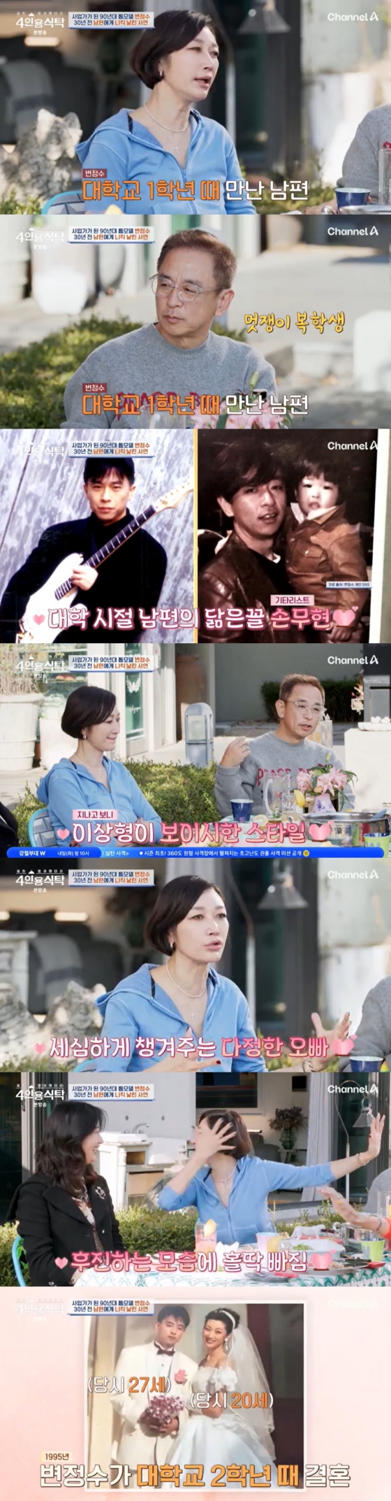 이날 변정수는 남편 유용윤 씨와 러브스토리를 전했다. 변정수는 "내가 남편을 처음 만났을 때는 내가 대학교 1학년생이었고 남편은 복학생으로 만났다. 그때는 이 얼굴이 아니었고 기타리스트 손무현, 잘생긴 김국진 느낌이었다"라고 말했다.