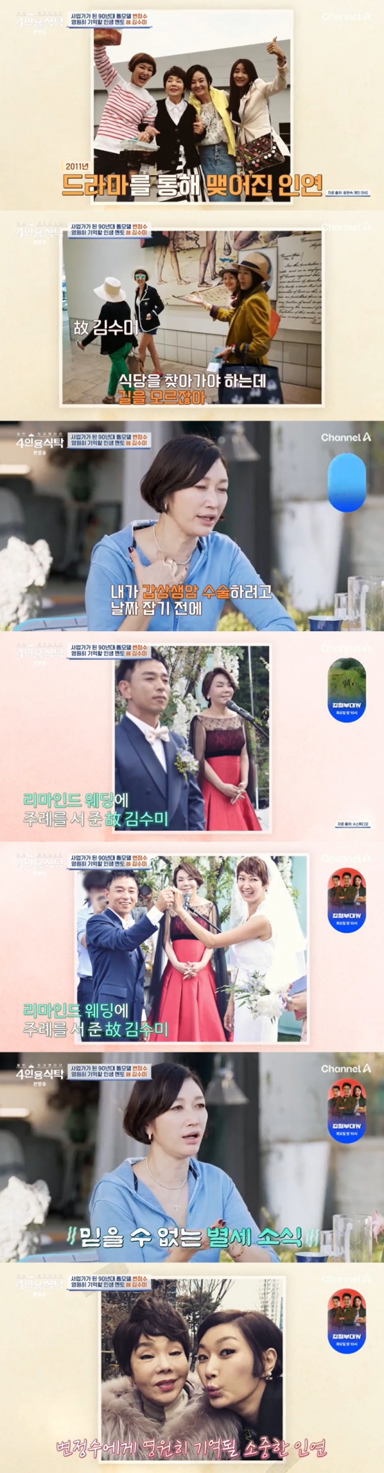변정수는 자신의 리마인드 웨딩 때 주례를 섰던 김수미를 추억하기도 했다. 변정수는 과거 윤현숙, 배종옥, 김수미와 함께 '애정 만만세'에 출연한 인연이 있었다.