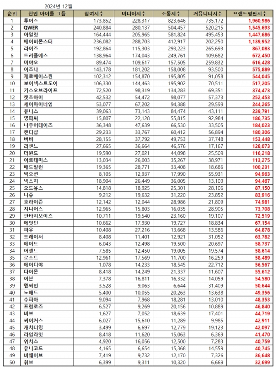 2024년 12월 신인 아이돌그룹 브랜드평판 30위 순위는 투어스, QWER, 아일릿, 베이비몬스터, 라이즈, 트리플에스, 미야오, 이즈나, 제로베이스원, 보이넥스트도어, 키스오브라이프, 캣츠아이, 세이마이네임, 유니스, 영파씨, 나우어데이즈, 캔디샵, 버비, 리센느, 더윈드, 아르테미스, 배드빌런, 빅오션, 넥스지, 오드유스, 니쥬, 호라이즌, 지니어스, 판타지보이즈, 에잇턴 순으로 분석됐다.