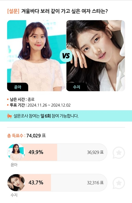 윤아는 지난 11월 26일부터 12월 2일까지 종합 엔터테인먼트 모바일 앱 스타폴(STARPOLL)에서 진행된 '겨울 바다 보러 같이 가고 싶은 여자 스타 스타는?' 설문에서 1위를 차지했다.