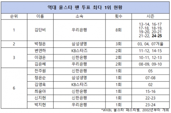 WKBL(한국여자농구연맹)은 지난 11월 21일부터 12월 2일까지 진행한 하나은행 2024~2025 여자프로농구 올스타 팬 투표에서 김단비가 전체 1위를 기록했다고 3일 발표했다.