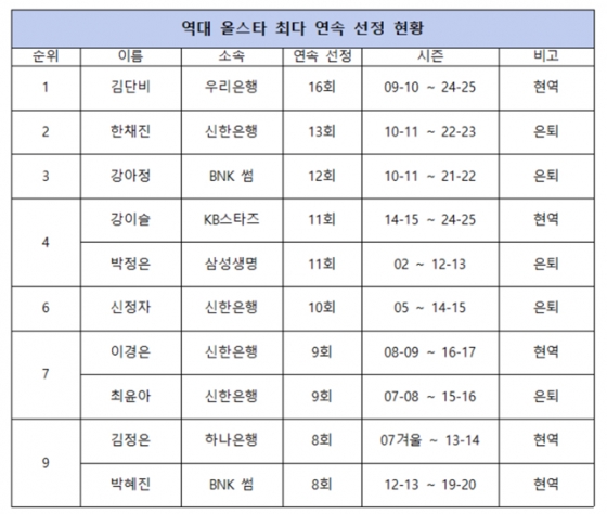 김단비는 총 2만 288표를 얻어 2위인 신한은행 신지현(1만 9895표)에게 393표 차로 앞섰다. 2013~2014시즌 첫 1위 이후 올 시즌을 포함해 역대 최다 1위 기록(8회)과 함께 2009~2010시즌 이후 16회 연속 올스타에 선정돼 이 부문에서도 최다 기록을 이어갔다.