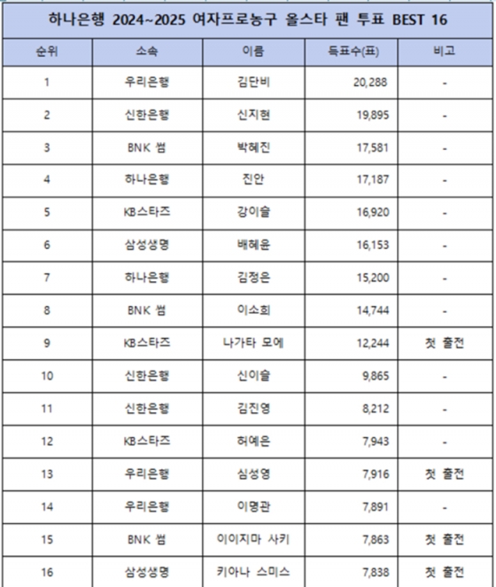 아시아쿼터 선수도 2명 포함됐다. KB스타즈 나가타 모에가 1만 2244표로 9위, BNK 썸 이이지마 사키가 7863표로 15위에 이름을 올렸다.