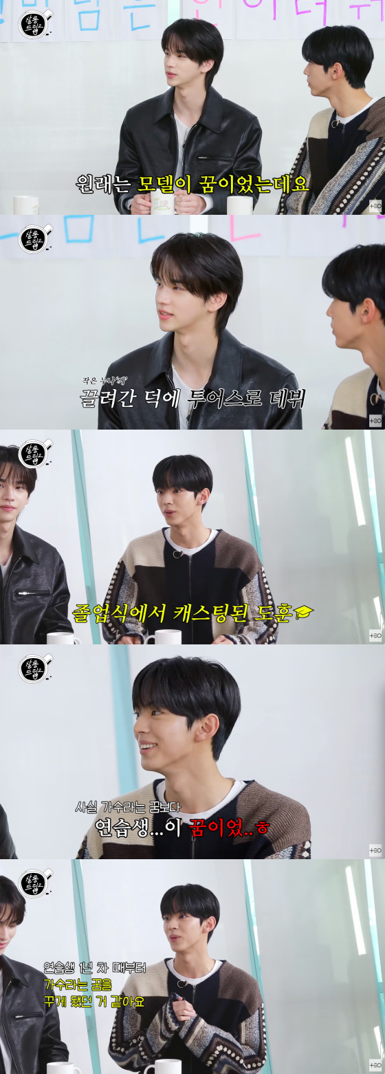 도훈은 "아는 동생의 졸업을 축하하러 초등학교 모교를 간 적이 있는데 거기서 캐스팅이 됐다"며 "그전에는 아예 이쪽 일에 관심이 없었다. 사실 가수보다는 연습생이 멋있어 보여서 그게 꿈이었다. 연습생 1년 차 때 가수를 꿈꿨다"고 답했다.