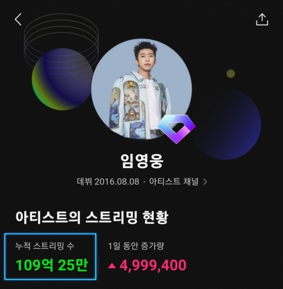 임영웅은 12월 4일 국내 주요 음원 플랫폼 멜론(Melon)에서 누적 스트리밍 109억 회를 넘어섰다. 이날 기준 임영웅의 멜론 누적 스트리밍 수는 109억 25만 회였다.