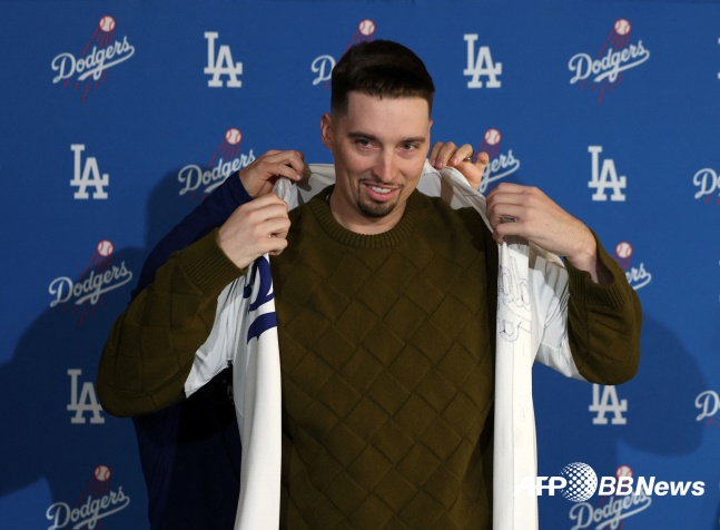 블레이크 스넬이 4일(한국시간) LA 다저스 입단식에서 유니폼을 입고 미소짓고 있다. /AFPBBNews=뉴스1