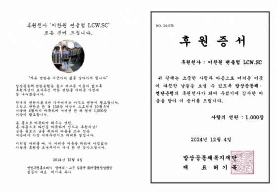 이찬원 팬클럽 'LCW.SC'는 "이찬원을 통해 누리는 행복과 기쁨이 기부의 원동력"이라며 "많은 사람들이 따뜻한 연말이 되기를 바란다"고 전했다.