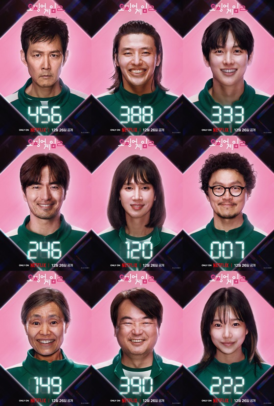 넷플릭스 새 오리지널 시리즈 '오징어 게임2'는 5일, 주요 캐릭터를 담은 캐릭터 소개 영상과 그들의 참가 번호가 담긴 포스터 9종을 공개했다. 이번 시즌은 복수를 다짐하고 다시 돌아와 게임에 참가하는 기훈(이정재 분)과 그를 맞이하는 프론트맨(이병헌 분)의 치열한 대결, 그리고 다시 시작되는 진짜 게임을 그린다.