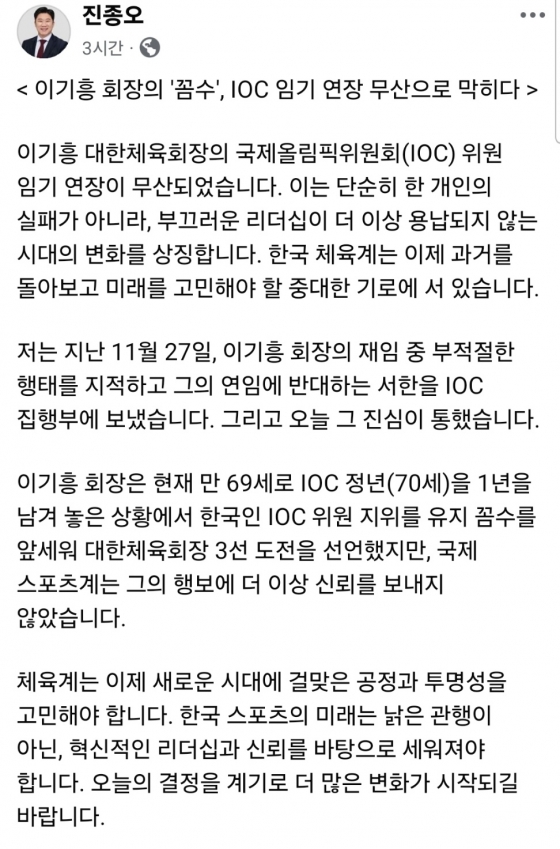 이어 진종오 의원은 "저는 지난 11월 27일 이기흥 회장의 재임 중 부적절한 행태를 지적하며 그의 연임을 반대하는 서한을 IOC 집행부에 보냈다. 그 진심이 통했다"며 "이기흥 회장은 IOC 위원 지위를 유지 꼼수를 앞세워 대한체육회장 3선에 도전했다. 하지만 국제 스포츠계는 그의 행보에 더는 신뢰를 보내지 않았다"고 강조했다.